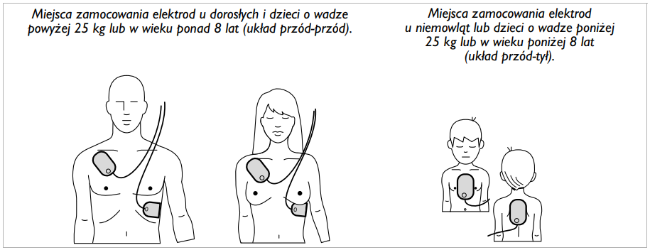 Elektrody należy umieścić na skórze klatki piersiowej ofiary dokładnie tak, jak przedstawiono na poniższym schemacie. Elektrody posiadają samoprzylepną warstwę, która z łatwością przylegnie do powierzchni skóry. Jeśli klatka piersiowa jest mocno owłosiona, należy usunąć włosy w miejscu przylepienia elektrod. Zestawy AED posiadają dedykowaną do tego celu maszynkę do golenia.