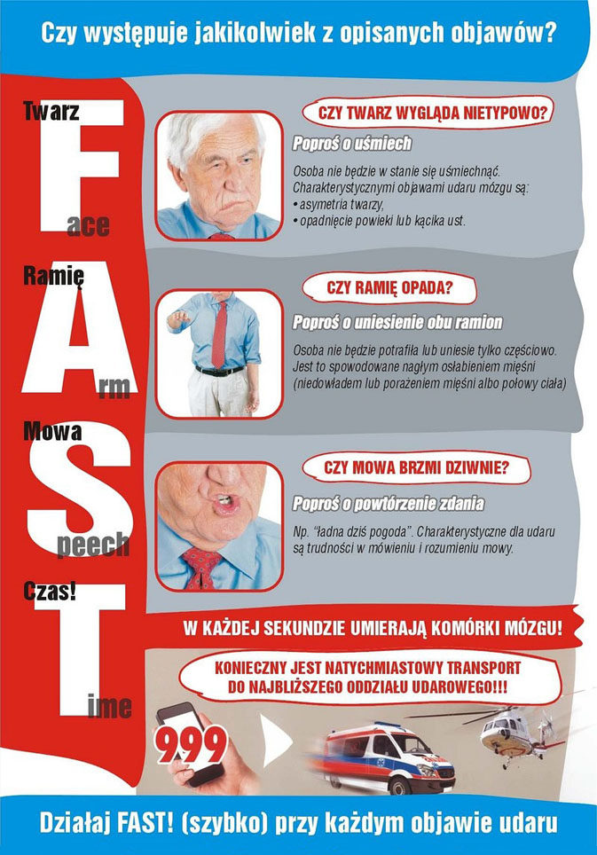 Wystąpienie ostrego incydent mózgowo-naczyniowy jest zawsze stanem bezpośredniego zagrożenia życia, bez względu na stopień nasilenia występujących objawów klinicznych. Udar mózgu niezależnie czy krwotoczny czy też niedokrwienny to proces, który ma dynamiczny przebieg i stabilizacja stanu chorego następuje dopiero po 4–5 dobach od czasu wystąpienia incydentu chorobowego. W początkowej fazie zachorowania, zaobserwować można słabo nasilone objawy deficytu neurologicznego. Jednak objawy te mogą ulec gwałtownej progresji w kolejnych godzinach lub też dniach trwania incydentu. Występujące w leczeniu udaru niedokrwiennego mózgu okno terapeutyczne jest wąskie. Sformułowanie to oznacza, iż optymalny czas na podjęcie decyzji o włączeniu leczenia trombolitycznego obejmuje pierwsze 4,5 godziny od momentu wystąpienia objawów choroby. Dlatego tak ważne jest szybkie i prawidłowe rozpoznanie objawów chorobowych, szybkość udzielenia pomocy medycznej. Czynniki te są jednymi z najważniejszych ogniw łańcucha przeżycia i rokowania pacjenta po udarze mózgu jak i jego późniejszej sprawności funkcjonalnej. Najlepiej sytuację tę obrazuje sformułowanie : „Czas to mózg”. Niezwykle istotnym elementem przeżycia pacjenta jest szybkie rozpoznanie objawów i niezwłoczne podjęcie aktywnego działania ratunkowego