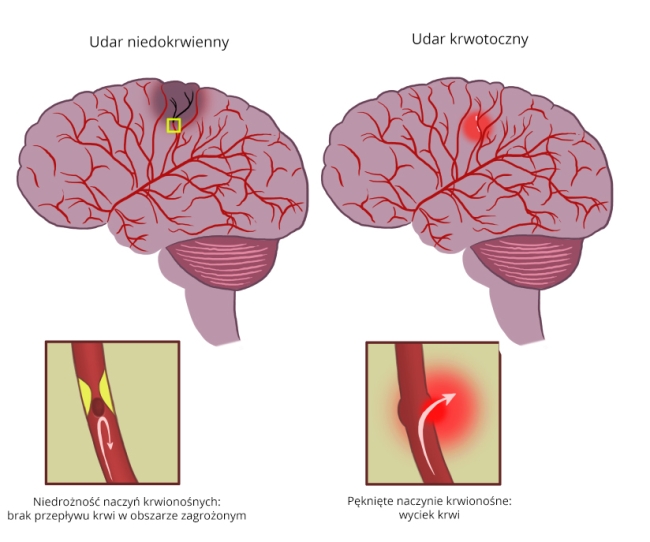 Udar mózgu może wystąpić na skutek zahamowania przez zakrzep dopływu krwi do mózg lub pęknięcia naczynia krwionośnego i uniemożliwienia dopływu krwi do mózgu. Dlatego też klasyfikowany jest na dwie grupy: udar mózgu krwotoczny i udar mózgu niedokrwienny.